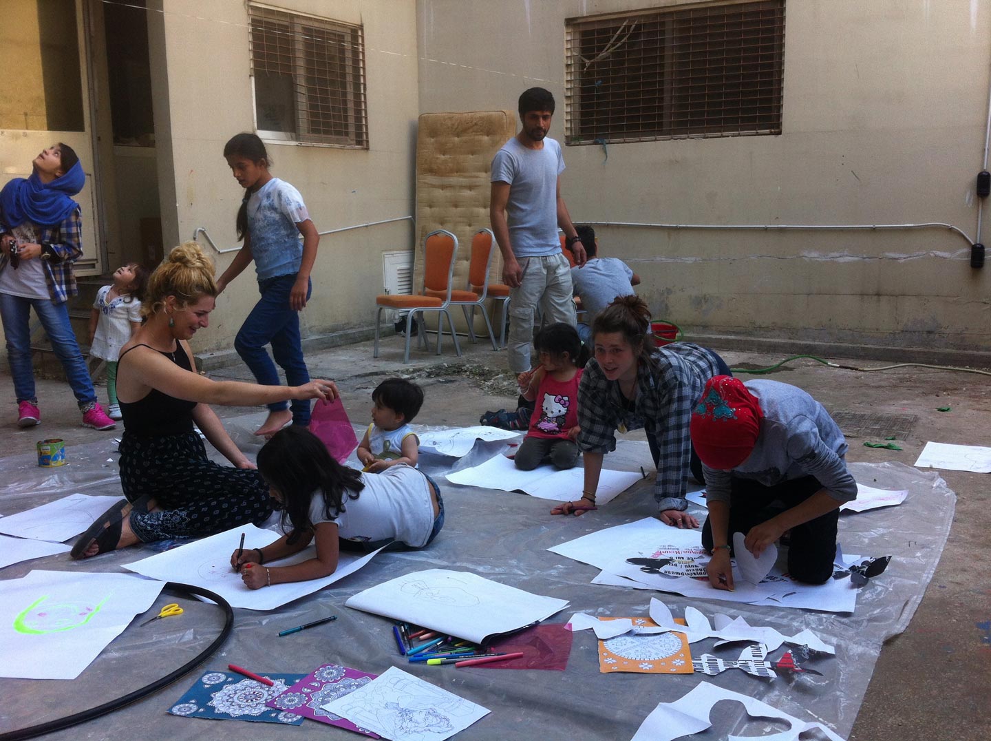Adults and children engage in painting at The Best Hotel in Europe, which lasted for 39 months. An exemplary space of solidarity and cooperation between locals and residents.