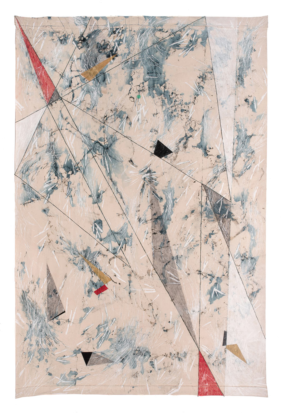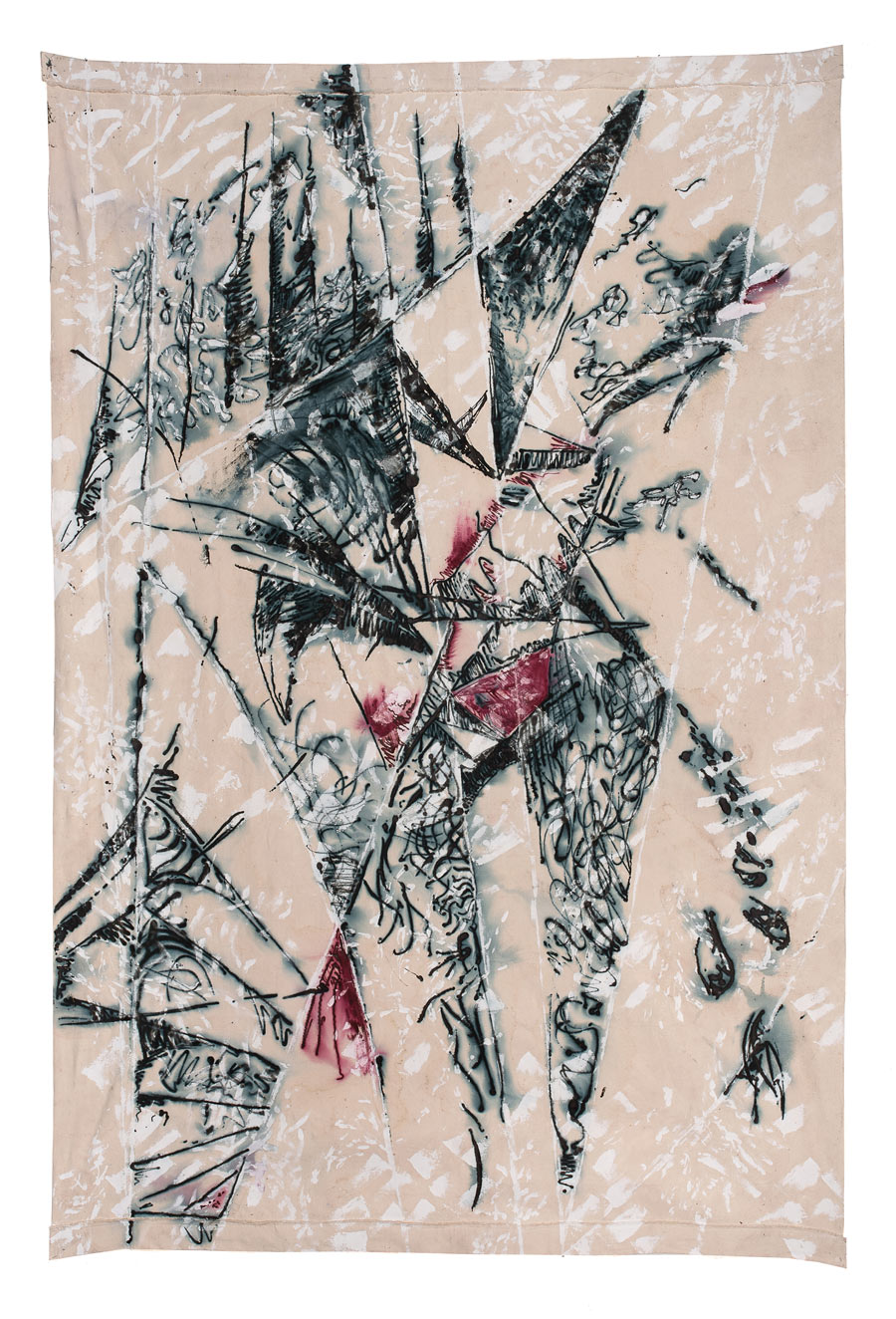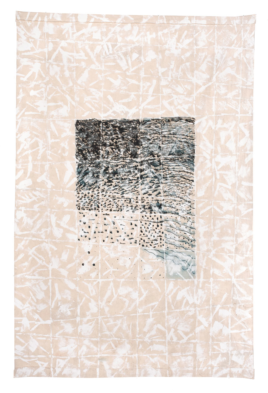 13 canvases hangings 3x1.5 meters each. With a vertical composition in mind, string was glued to the surface of one side of the canvas, to delineate an initial structure. The same surface was then ‘textured’ by differing white markings. An ‘echo’ of the initial side was created on the reverse, with the string lines picked out in the white texturing, individualising each of the 13.