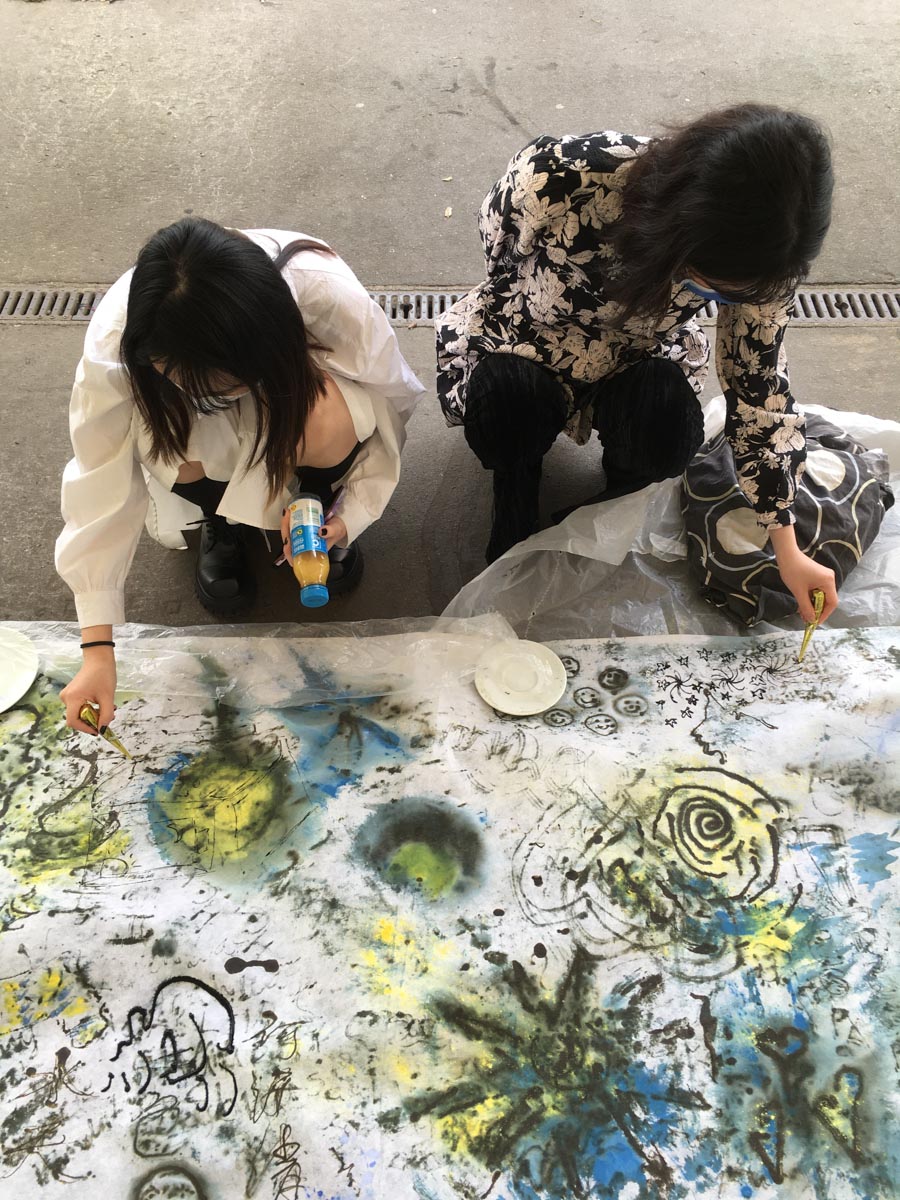 With 76 participants, the pieces quickly became dynamic, and Gail’s final addition of blue and yellow emulsion, brought the compositions their final rhythm. The paintings were finally hung horizontally, high within the structure of the canopy, with only the wind as a distraction.