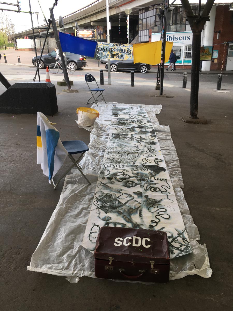 For 3 weeks Gail engaged with Portobello’s local community in painting four 7 metre lengths, based on the colours Blue and Yellow, in support of the Ukraine. Under the protection of the Market Canopy, the lengths of fabric were laid out and passers-by were invited to utilise black henna in cones as a painting device. With the addition of water, the individual contributions work was not only unified, but blues and yellows appeared from the black.
